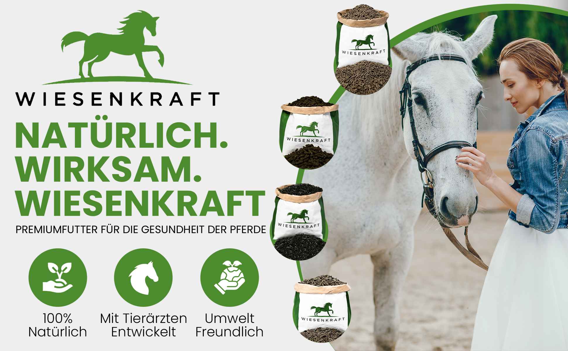 Bei Wiesenkraft steht das Wohl Ihres Pferdes im Mittelpunkt. Unsere in Deutschland hergestellten Ergänzungsfuttermittel für Pferde sind frei von Getreide, Melasse und Industriezucker. Entwickelt in Zusammenarbeit mit Tierärzten, bieten sie eine natürliche und gesunde Ernährung für Ihr Pferd.